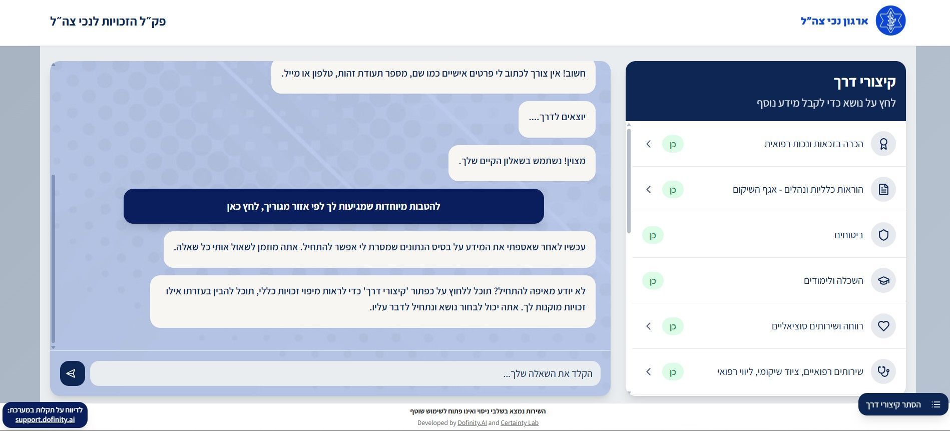 Among our most meaningful initiatives is the development of the AI-based system “פק״ל הזכויות לנכי צה״ל”—an Israeli “field-kit” style knowledge assistant focused on helping IDF disabled veterans access and understand their rights, services, and support pathways, developed in collaboration with the IDF Disabled Veterans Organization.